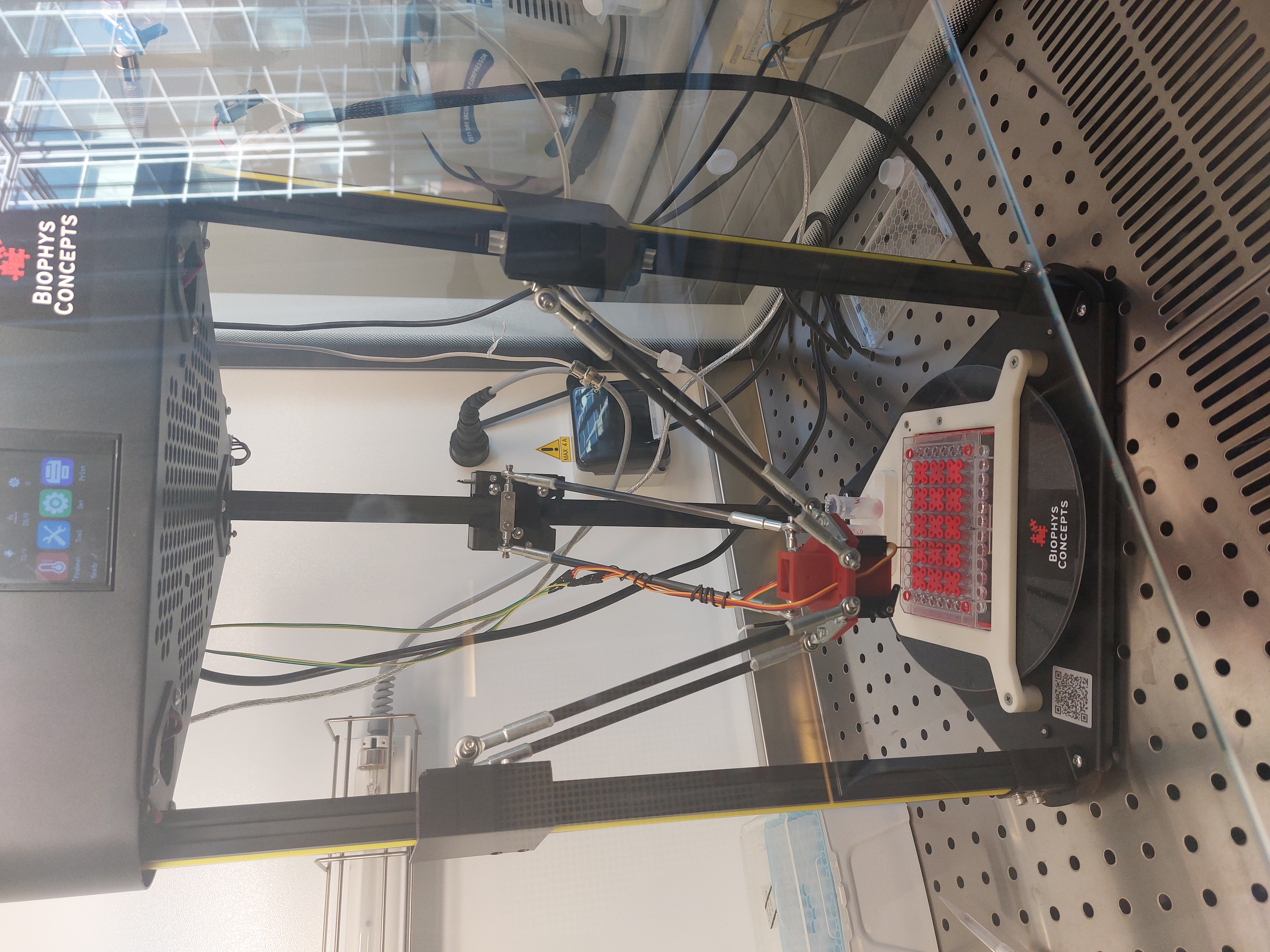 A delta robot moves a chopstick electrode to measure the transepithelial electrical impedance (TEER) of transwell cultures within a multi-well plate.