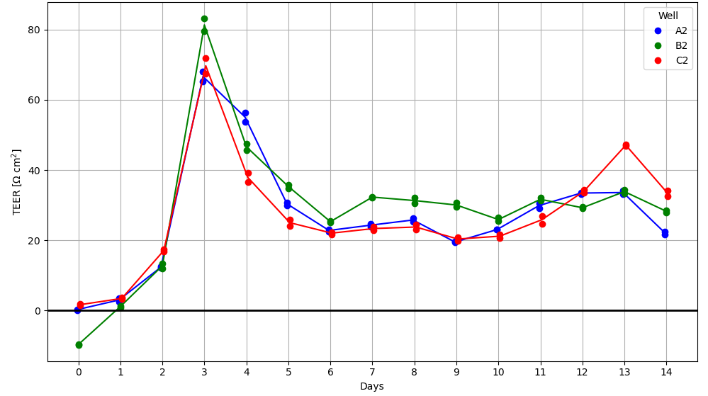 The transwell diffusion chamber is a widely employed in vitro model for studying biological barrier tissues. It involves cultivating a cell layer on a porous membrane within a transwell insert. The quality of this cell layer's seal can be assessed by measuring the Transepithelial Electrical Resistance (TEER) between the apical and basolateral compartments, with a cell line-dependent characteristic TEER value indicating a well-sealed barrier. The TEER Scanner system automates the repetitive measurements of transwell cultures in multi-well plates.